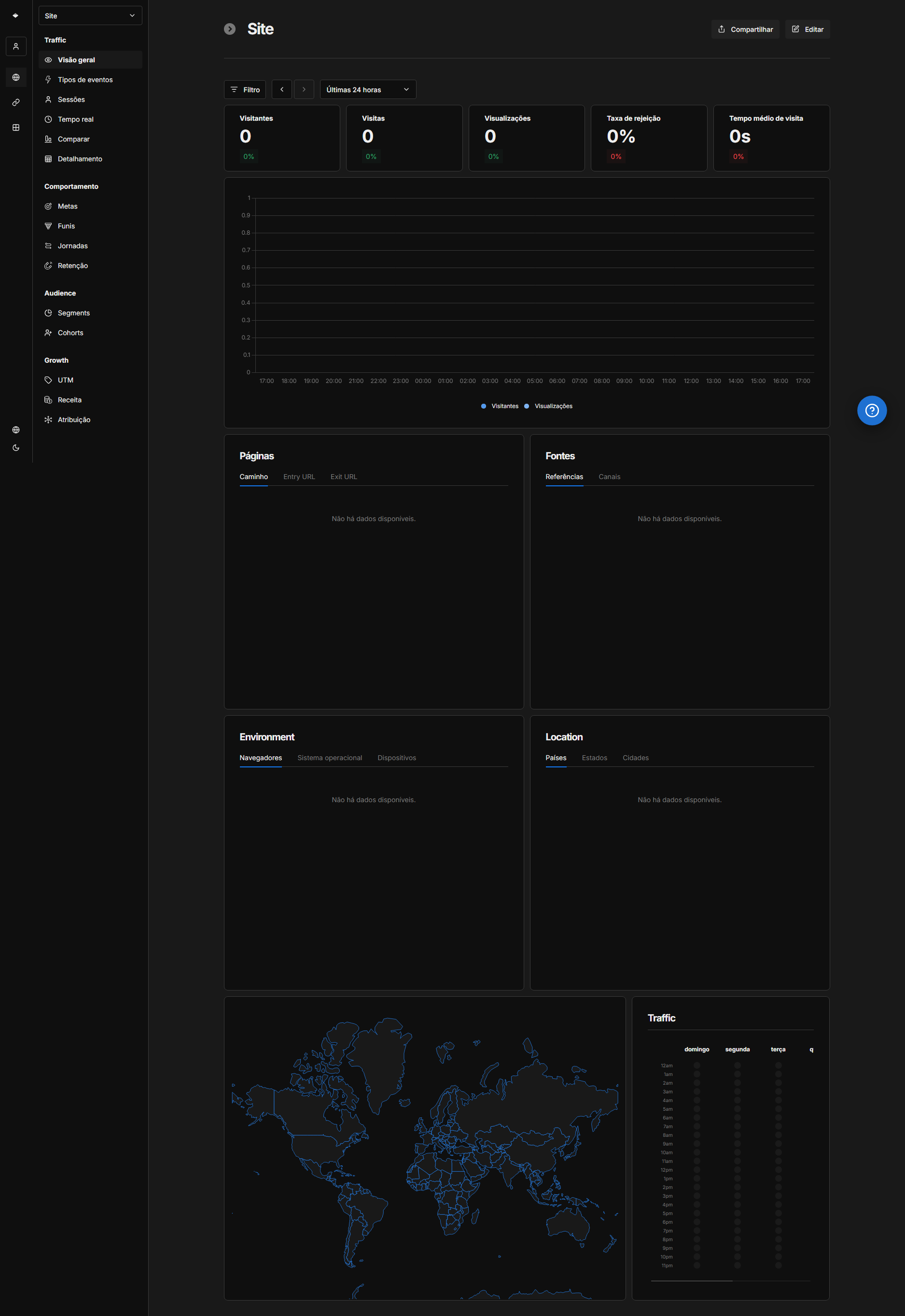 - Dashboard de uma única página: Todas as informações importantes (visitantes, visualizações, fontes, países) estão em uma única tela. Sem menus infinitos.